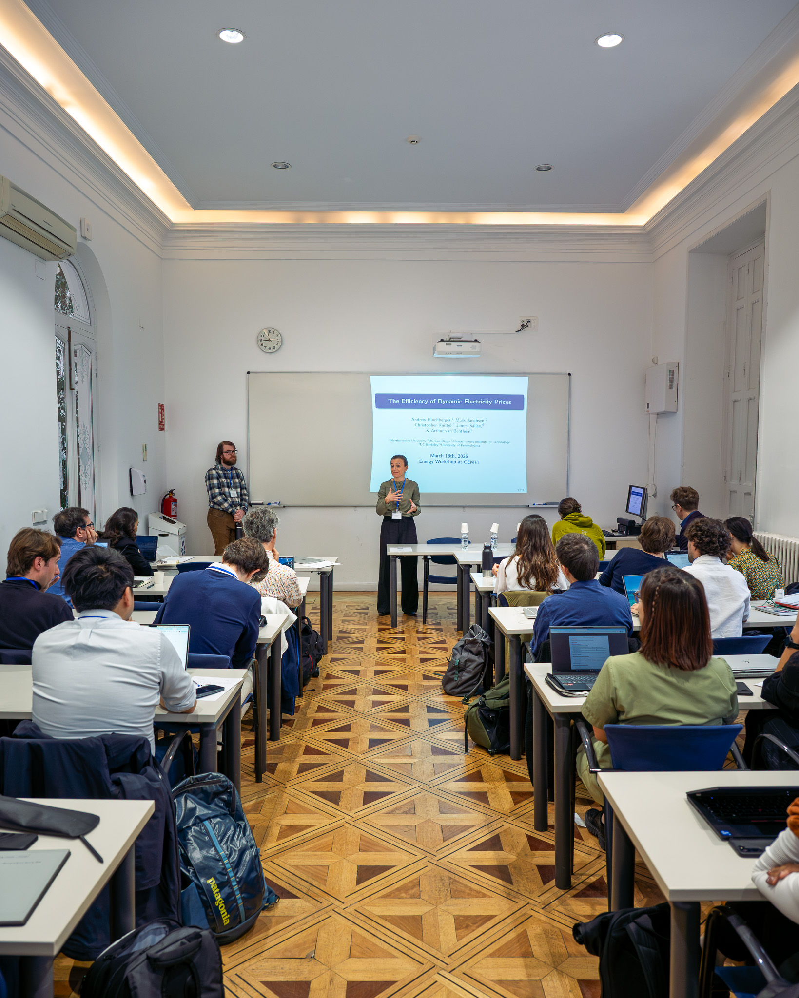The programme combined short paper and long paper sessions, with participants from institutions including the University of Chicago, Northwestern University, Aalto University, Toulouse School of Economics, ULB, University of Girona, CUNEF, University of Vienna, University of Navarra, Universidad Carlos III de Madrid, Ifo/LMU Munich, Paris School of Economics, and CEMFI. Topics ranged from dynamic electricity pricing, retail contract design and real-time pricing to water stress and nuclear supply, climate and industrial policy, charging infrastructure for electric vehicles, natural gas market integration, residential solar subsidies, transmission constraints and information in wholesale electricity markets.